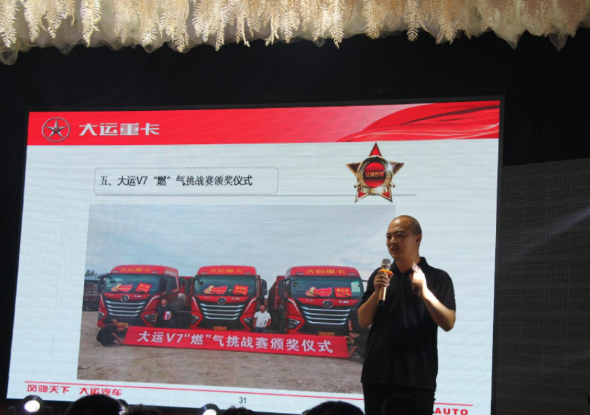 活动会场气氛热烈,广达汽贸销售总经理马经理分享了大运重卡的客户的真实案例,作为大运重卡的实际用户,无论是在自重、气耗还有安全上,都验证了大运重卡的可靠性和经济性,作为商家,只有为客户着想,才能获得信赖和忠实!