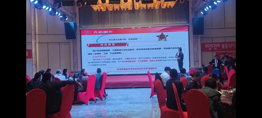 之后河南大区高级服务经理马红辉向客户解读了大运重卡的售后服务政策,强调了大运重卡是首家提出,并且一直坚持“终身质保”服务政策的品牌,在讲解中通过生动的案例向卡友许出“你尽管买大运,我为你保驾护航”的承诺,赢得了现场满堂喝彩。
