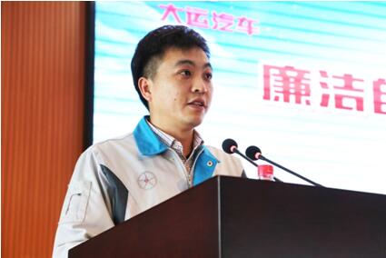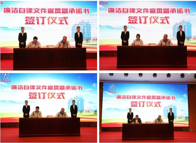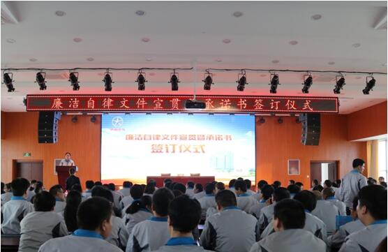 随后,公司副总经理级任职管理人员代表——生产副总经理孙兆明、中层任职管理人员代表——供应副总经理助理张椿、员工代表——品质管理部裴志伟、合作方代表——潍柴动力销售经理于爱军分别向大会作廉洁自律承诺,并同陈澔利总经理签订廉洁自律承诺书。