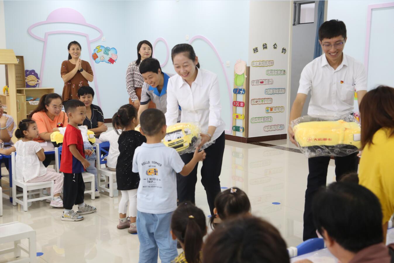 工会、共青团、妇联代表分别为小朋友赠送大运公仔