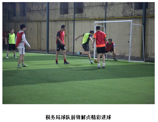 下半场比赛,在税务局球队潮水般的攻势中拉开序幕。双方球员激烈拼抢,尽情发挥球技,抢断、过人、射门、扑救……精彩场面应接不暇,既有进球时双方队员的齐声喝彩,也有球打门柱时共同的遗憾叹息。大家你追我赶,奋力驰骋,大有“球场争锋,舍我其谁”之势。“大运红坦克”队前锋王静在下半场表现抢眼,梅开二度,连进两球,一举将比分拉大,使球队居于绝对优势地位。
