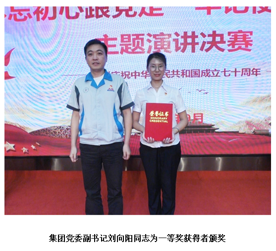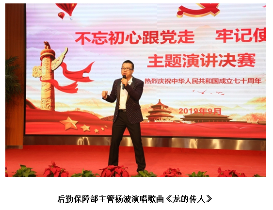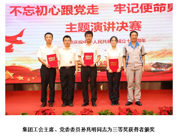 演讲比赛现场,选手们紧紧围绕“不忘初心 牢记使命”这一主旋律,结合本职工作,立足岗位实际,从不同角度、不同层面,说身边的人、讲党员的事。有的感叹祖国70年来发生的巨变,讴歌为中国发展做出突出贡献的英雄模范;有的追忆老一辈共产党人矢志不渝、百折不挠、一心为民的革命信念;有的颂扬在基层岗位上脚踏实地、辛勤工作的优秀党员代表……参赛选手们声情并茂的演讲博得了现场评委和观众的阵阵掌声。经过激烈角逐和评委们的专业评审,最终,来自生产系统党支部的秦钥获得一等奖,来自研发系统党支部的李正、生产系统党支部的王泽辉获得二等奖,来自集团联合党支部的姚磊、行政联合党支部的张霜、研发系统党支部的芦瑞瑞、张帆获得三等奖。比赛过程中,大学生党员肖文轩同志和后勤保障部主管杨波同志分别为大家深情演唱了歌曲《红旗飘飘》、《龙的传人》。