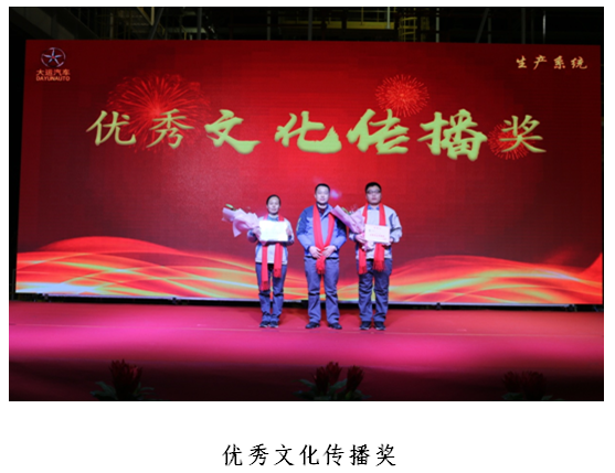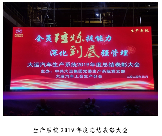 1月20日晚,以“全员锤炼提能力,深化到底强管理”为主题的大运汽车生产系统2019年度表彰大会在生产现场隆重召开。出席会议的公司领导有大运九州集团党委书记刘向阳、生产副总经理孙兆明、供应副总经理助理马鲁堂、总经理行政助理吴德峰以及来自公司各系统的特邀嘉宾,连同获奖代表及员工代表共计700余人欢聚一堂,共享盛典。